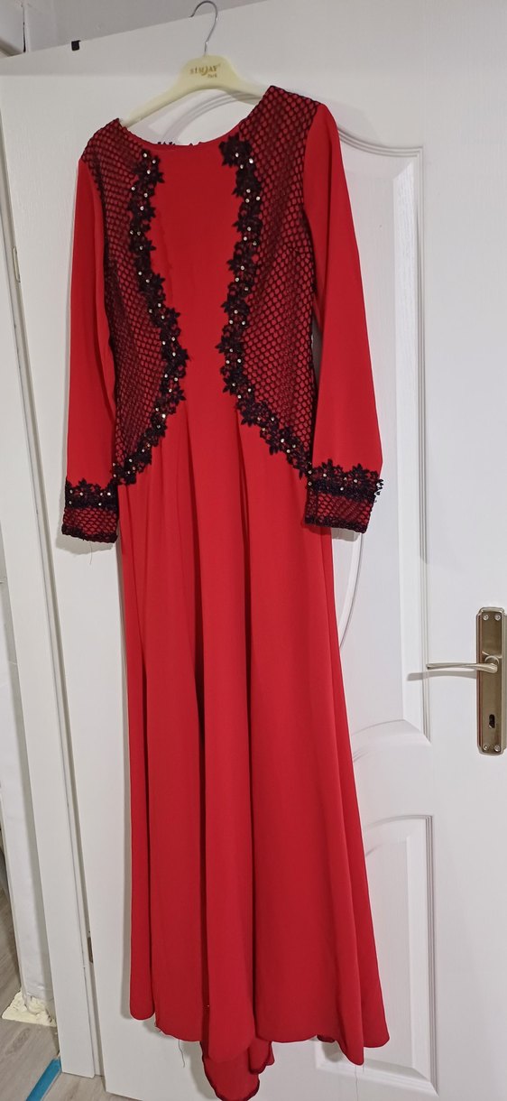 Kırmızı, uzun kollu, işlemeli ve boncuklu detaylara sahip, oturan kesim uzun abiye elbise. Düğünler için uygundur.