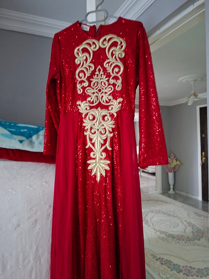 Kırmızı İşlemeli Uzun Kollu Abiye Elbise