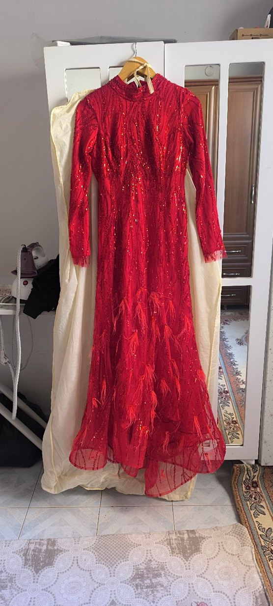 Parlak kırmızı, uzun kollu ve kayık yaka abiye elbise. İşlemeli desenler ve drapeli detaylarla süslenmiş, düğünler için uygun dar kesim elbise. ✨ sadece bir kere giyildi 36 38 için uygun kira fiyatına abiye elbise kaçırmayın