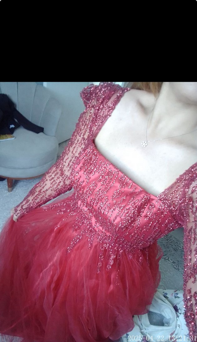 Kare yaka, uzun kollu ve işlemeli detaylara sahip kırmızı, vücuda oturan bu uzun elbise, drapeli bohem tarzıyla düğünler için uygundur.