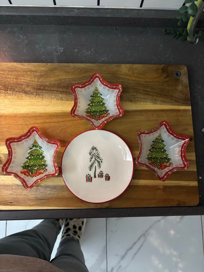 Kırmızı kenarlıklı, işlemeli yılbaşı ağaç desenli yıldız ve yuvarlak tabaklardan oluşan set. Ortadaki porselen diğerleri cam. Porselende zırhlamadan kaynaklı çatlak gibi duran görüntü var ama çatlak değil.