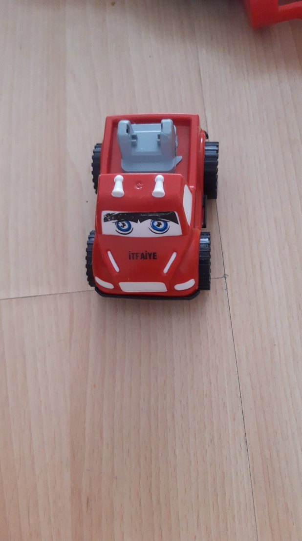 Renkli kırmızı itfaiye oyuncak arabası, önünde 'ITFAIYE' yazısı ve üstünde merdiven detayları bulunur.