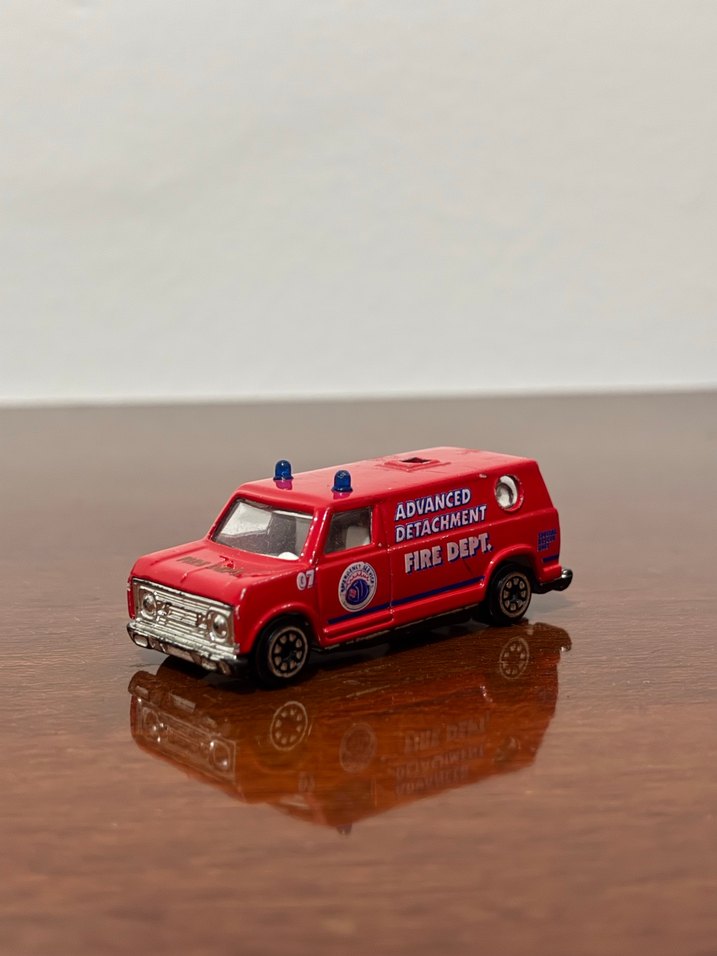 Kırmızı renkte, üzerinde 'ADVANCED DETACHMENT FIRE DEPT.' yazan itfaiye detaylarına sahip oyuncak araba. Üstünde mavi sirenler ve detaylı tekerlekleri var.