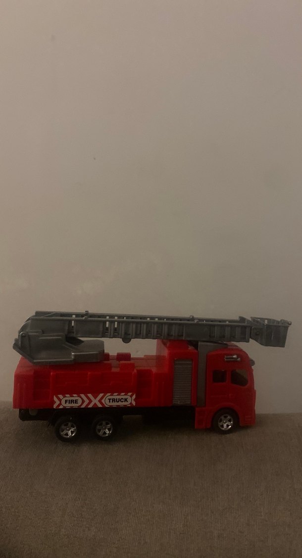 Gri uzatılabilir merdiveni ve detaylı tekerlekleri olan kırmızı itfaiye oyuncak arabası.