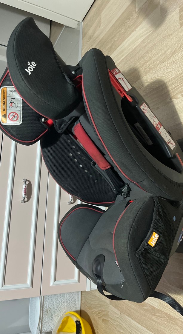 Joie marka, koyu kırmızı ve siyah renklerde çocuk araç koltuğu, yan koruma ve ayarlanabilir başlık ile güvenlik sağlar. 15-25 kg için.