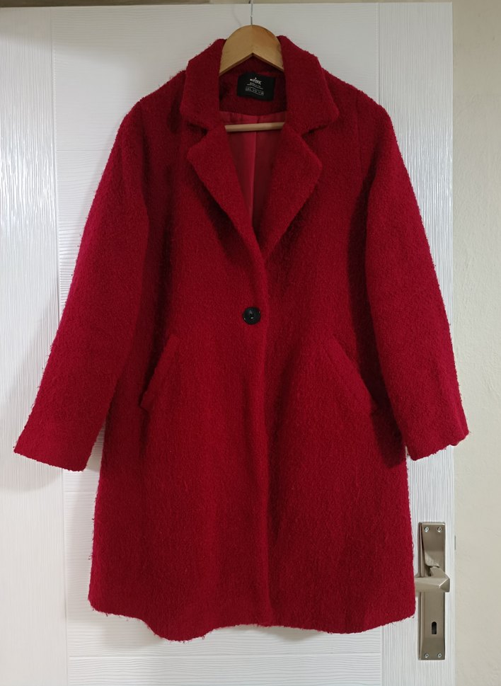 Yumuşak dokulu kırmızı tek düğmeli kaban, yakalı ve yan ceplidir. İç kısmı sıcak tutan astarlıdır. Kaliteli sağlam ihtiyaç fazlası olduğu için satıyorum.
