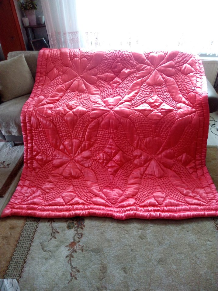 Canlı nar çiçeği renkte, kabartma çiçek desenli yorgan, sıcaklık ve doku sağlar.