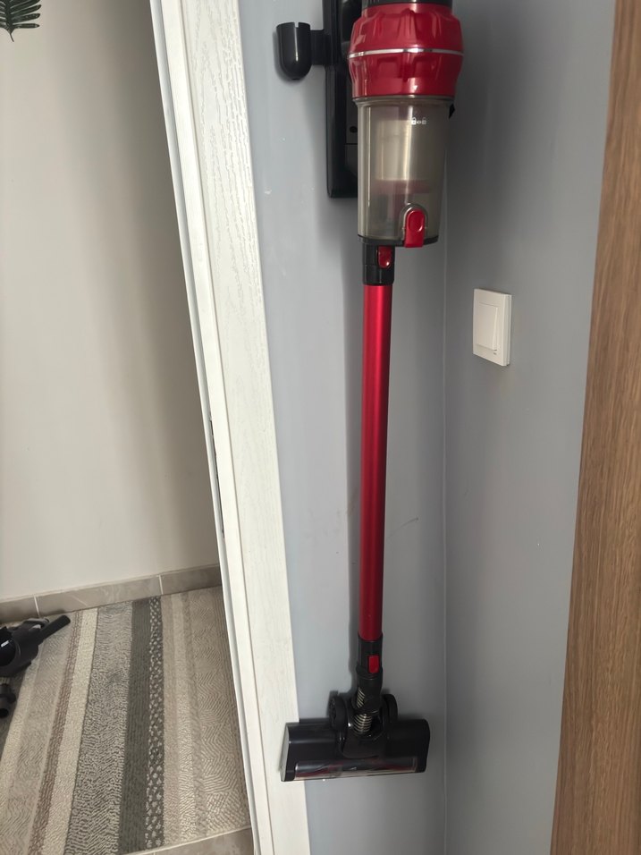 Şeffaf toz haznesi ve duvara montaj aparatı bulunan koyu kırmızı kablosuz dikey elektrikli süpürge. Alıcsk olan kişi bataryasının olmadığını bilerek alsın yani ben bataryayla yollicam ama bataryasında peoblem var. Veya parçaları lazımsa o şekilde de satabilirim o zaman fiyat değişir