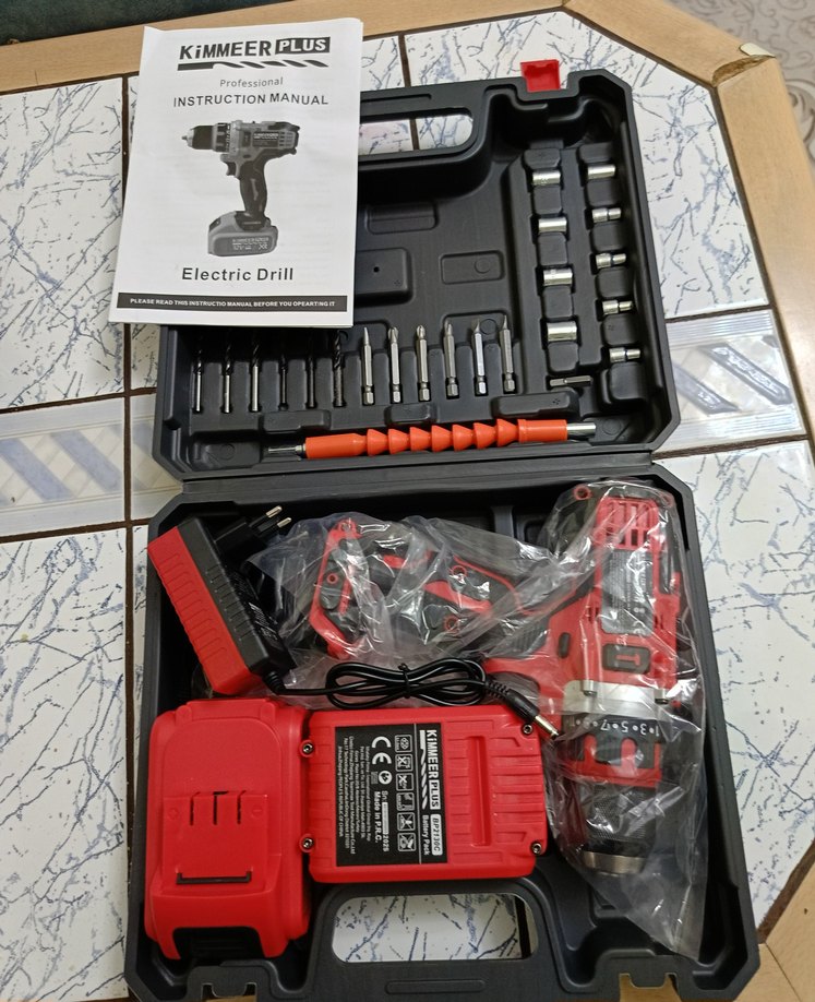 Kırmızı kablosuz elektrikli matkap seti, çeşitli uçlar ve aksesuarlarla birlikte siyah taşıma kutusunda düzenli olarak sunulmaktadır. Kullanım kılavuzu dahildir. not tek fiyat