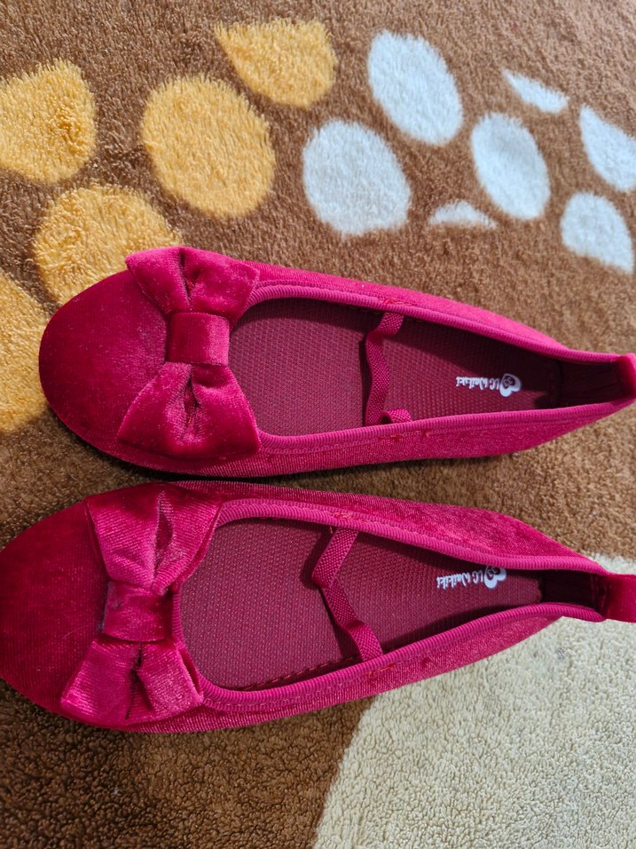 kırmızı kadife fiyonk detaylı kız babetleri. Konvansiyonel ve desensiz tasarıma sahip, rahat ve dayanıklı kauçuk malzeme kullanılmış. 1 kez gosteride giyildi