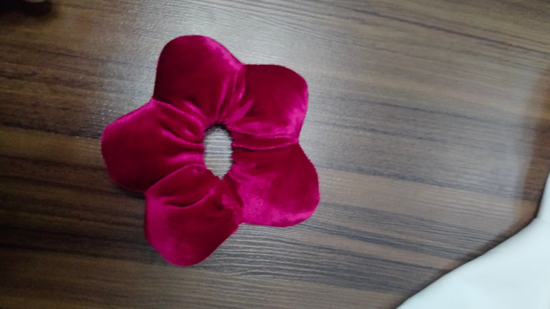 Kırmızı kadife görünümlü, yumuşak dokulu ve çiçek tasarıma sahip saç tokası, canlı ve şık bir görünüm sunar.