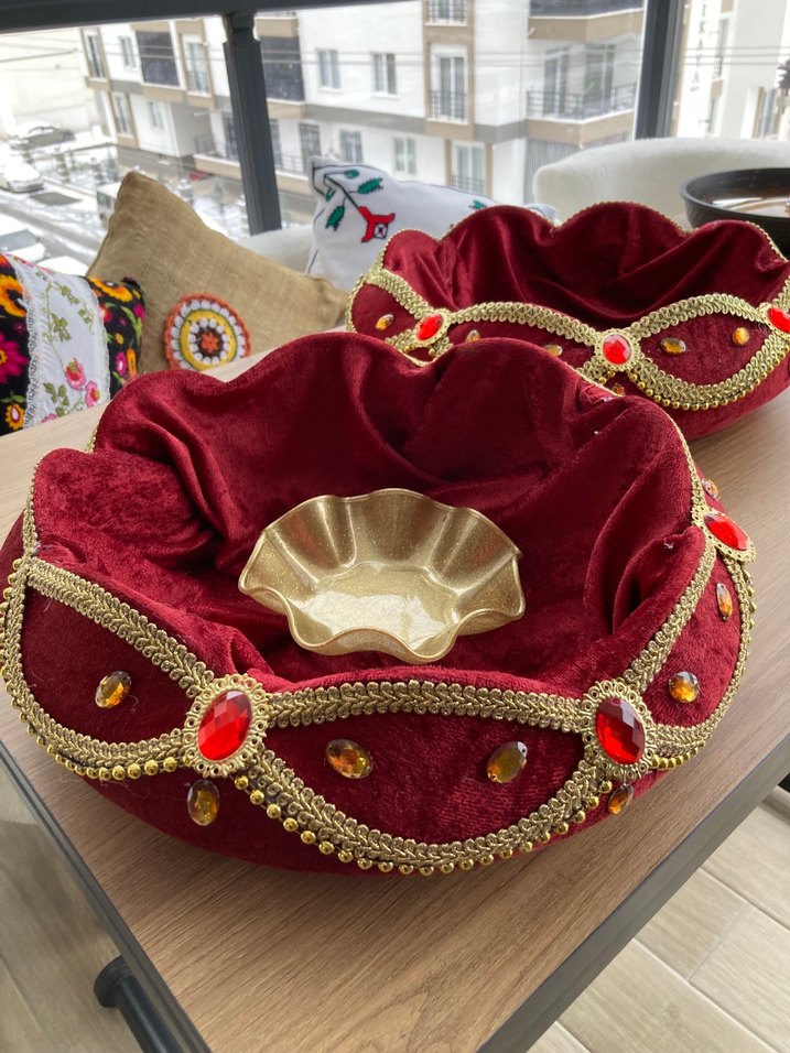 Kırmızı kadife ve altın boncuklarla süslenmiş, ortasında altın renkli küçük kase bulunan el işi tepsi. 2 adet yelpaze 1 adet tef ile birlikte