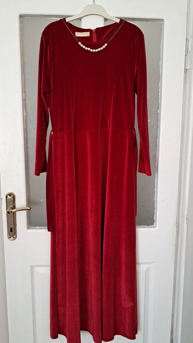 Kırmızı renkte, kadife süet kumaştan uzun kollu , salaş kesim ve drapeli tasarıma sahip uzun elbise, romantik akşamlar için uygun. 2 kere giyildi