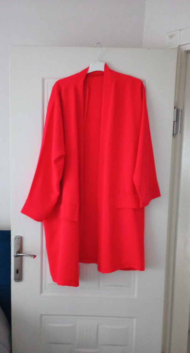 Kırmızı renkte, uzun kollu, yaka detaylı ve süs cep özellikli rahat kesim uzun boy kadın ceket . Yumuşak ve sıcak dokusu günlük ve özel günler kullanım için uygundur. 2 kol arası 65 #boy94 cm içindeki beyaz içlik dahil değildir