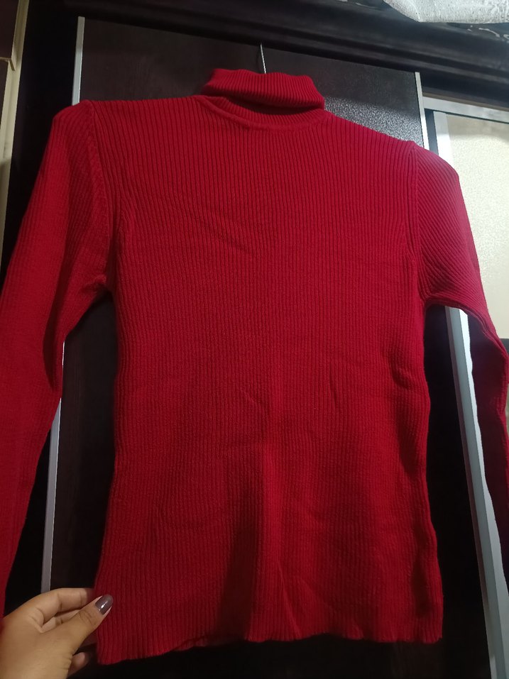 Kırmızı, balıkçı yaka, uzun kollu, fit kesim, parlak yüzeyli yün triko kazak. Normal midi boyda, rahat ve şık sokak stili için uygundur.
