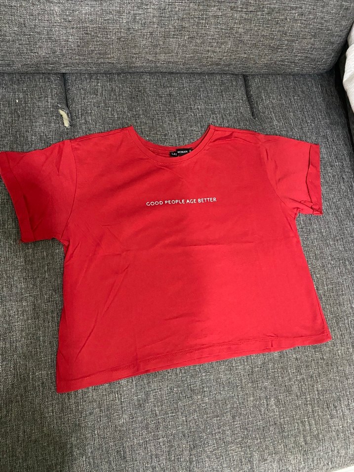 Kırmızı, kısa kollu, bisiklet yakalı pamuklu kadın tişörtü, baskılı sloganıyla minimalist ve günlük şıklık sunar.