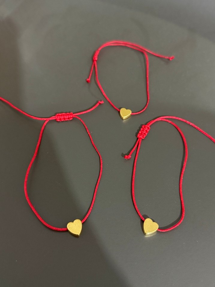 Kırmızı elastik ipten yapılmış, nakışlı kalp detaylı kadın bileklikleri. Romantik akşamlar için minimal ve renkli tasarım, bohem tarzıyla uyumlu.