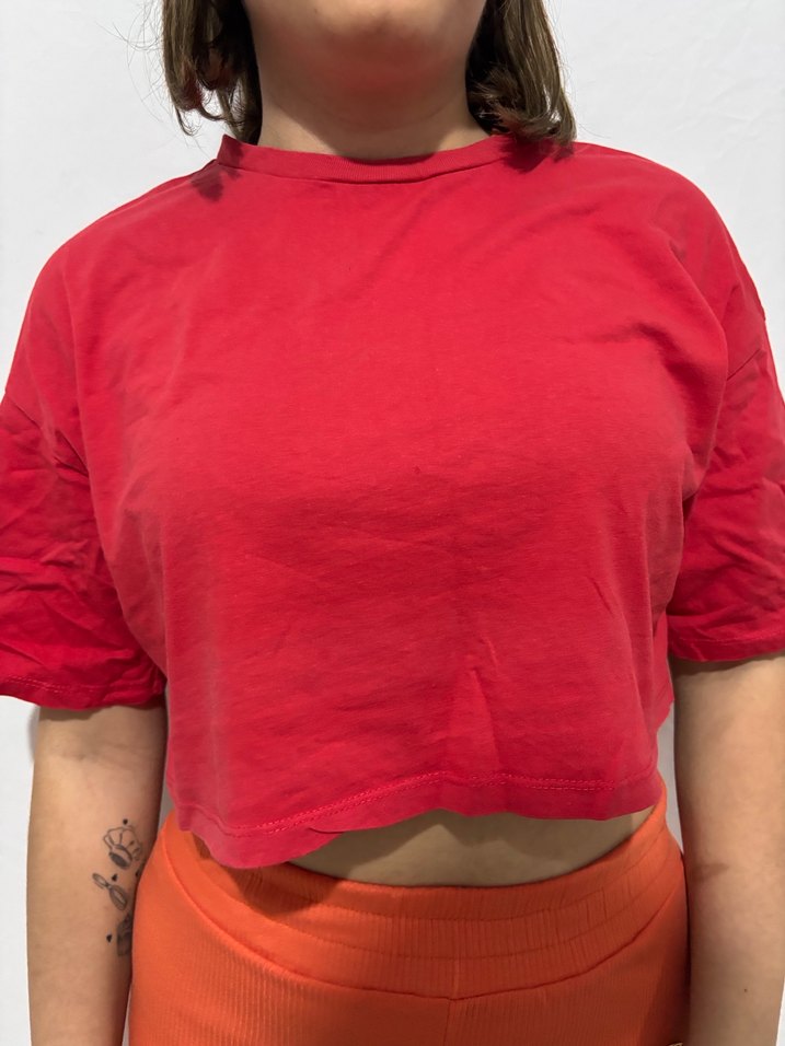 Pamuklu kırmızı kadın tişört, bisiklet yaka ve kısa kollu, bol kesim. Günlük kullanıma uygun, rahat ve renkli sokak stili tişört.