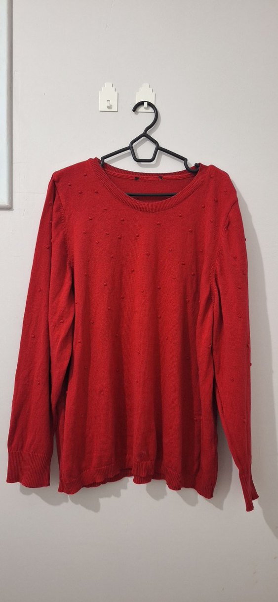 Kırmızı renkli, bisiklet yaka ve uzun kollu, bol kesim triko kazak. Düz ve desensiz tasarımı günlük sokak stiline uygundur.