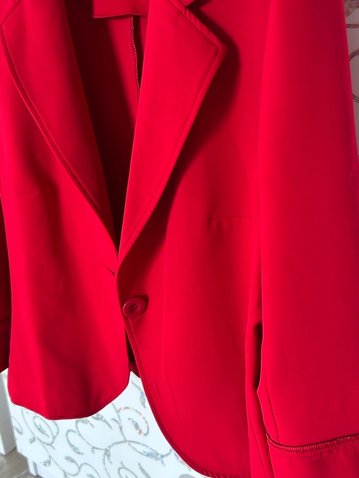 Kırmızı kadın blazer ceket, düğmeli ve kesik yakalıdır. Strappy kollu, normal uzunlukta ve regular fit olup ofis için uygundur. Desensiz ve renkli görünüm sunar.