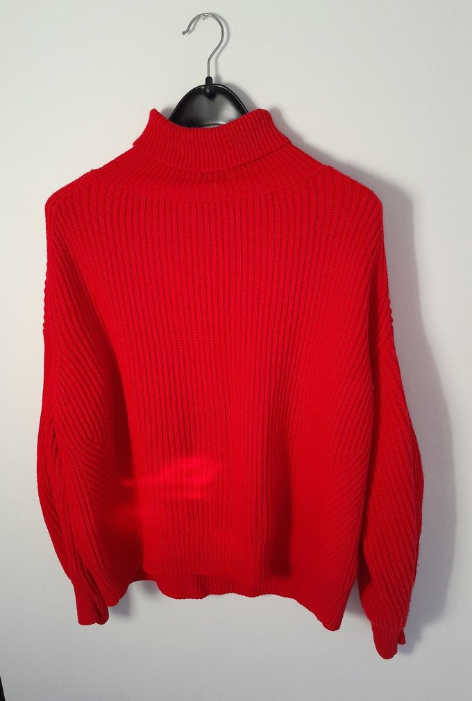 Kırmızı renkte, boğazlı ve uzun kollu örgü kadın kazak. Salaş kesimi ve normal boyu ile günlük kullanım için uygundur. Desensiz, sade tasarımı sokak stiline uyum sağlar.