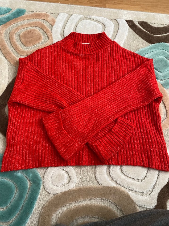 Kırmızı renkte, boğazlı ve uzun kollu, bol kesim triko kazak. Rahat ve sade tarzıyla günlük kullanıma uygun, orta boy uzunlukta, desensiz ve renkli bir model.
