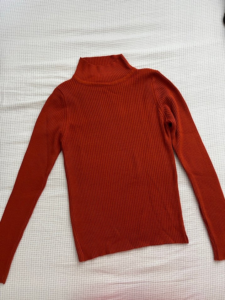 Koyu kırmızı renkte, boğazlı ve uzun kollu, triko örme kumaştan yapılmış, vücuda oturan kadın kazak. Günlük sokak stili için uygun, normal uzunlukta.