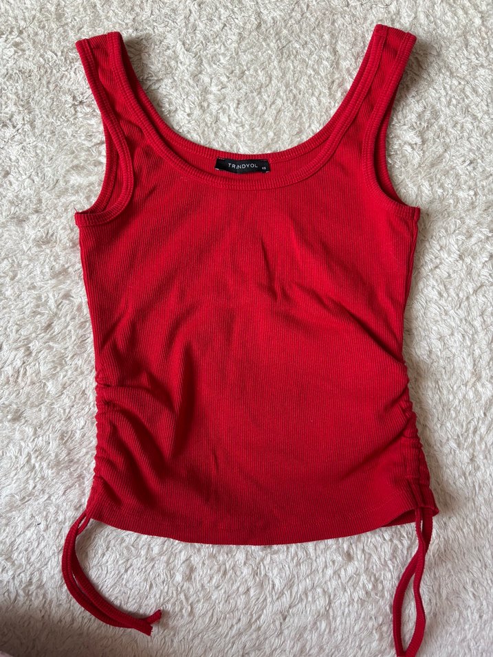 Kırmızı, kolsuz ve yanları büzgülü ayarlanabilir bağcıklı, yumuşak sentetik kumaştan yapılmış dar kesim atlet, günlük sokak stili için uygundur.