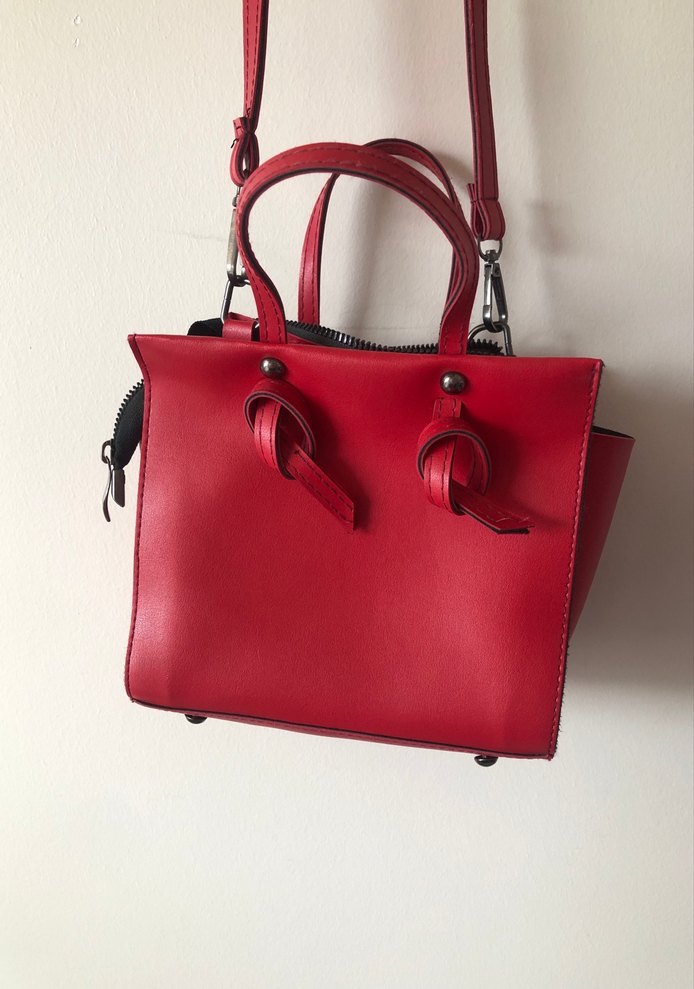 Cesur ve minimalist kırmızı deri kadın çanta, tokalı tasarımı ve çağdaş stiliyle romantik akşamlar için uygundur. Düz ve desensiz yüzeye sahip, saplı ve çıkarılabilir askılıdır. ❤️ askı kısmında görselde görünen hafif leke mevcuttur