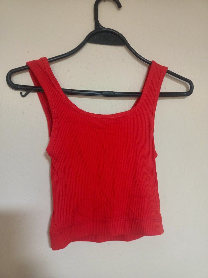 Kırmızı, straplez yaka ve kolsuz, vücuda oturan crop top, günlük sokak stiline uygun düz ve rahat sentetik kumaştan yapılmıştır.