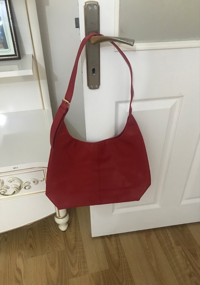 Bu kırmızı deri çanta, tokalı askıya sahiptir. Günlük sokak stili için uygundur ve desen içermeyen sade, minimal bir tasarıma sahiptir.