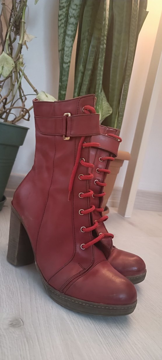 Kırmızı deri, yüksek topuklu kadın botları, tokalı ve bağcıklı detaylara sahip. Koyu kırmızı, desensiz tasarım, günlük kullanım için uygundur. sadece bir fermuarinin tokası yok. onun dışında bir kusuru yoktur.