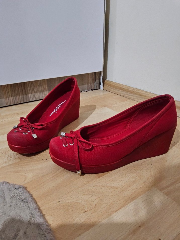 Kırmızı, bağcıklı detaylı, kauçuk tabanlı kadın dolgu topuklu ayakkabı. Minimalist tarzda günlük kullanıma uygun.