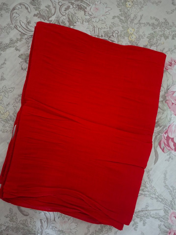 Yumuşak sentetik kumaştan, canlı kırmızı renkte, drapeli tasarıma sahip kadın şalı. Rahat ve bohem tarz için ideal. parlak sim geçişli kumaş