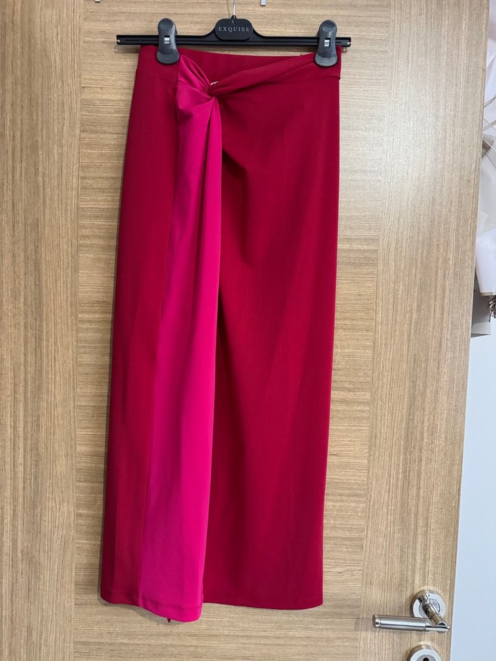Kırmızı renkli, drapeli ve uzun etek, düzenli kesimiyle modern ofis stiline uygundur.