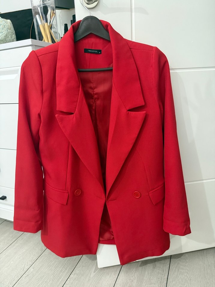 Kırmızı, düğmeli, kesik yaka kadın blazer ceket. Parlak sentetik kumaş, normal kesim ve uzunlukta, askılı kollu ve desensiz tasarıma sahiptir. En 40 boy 76 hiç bir şeyi yok tertemiz rengini kendime yakıştıramadım onun yerine siyahı ya da grisini almak istıyorum 53 bedenim çok rahat oluyor