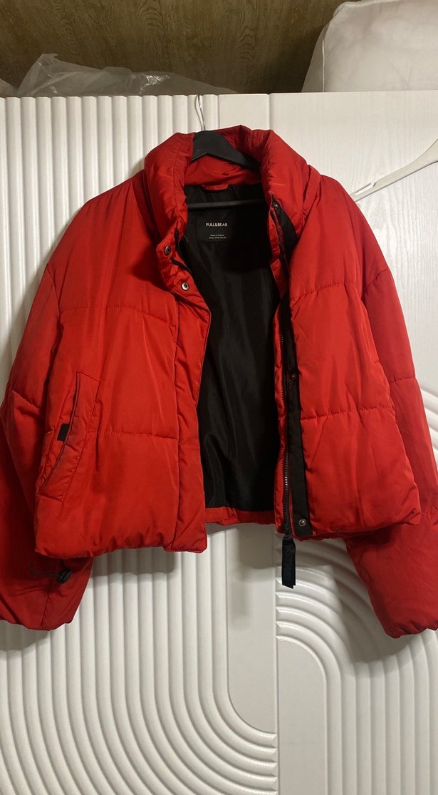 Düğmeli, yüksek yakalı kırmızı kadın kış montu. Yumuşak ve sıcak kumaşıyla günlük kullanıma uygundur. ❄️