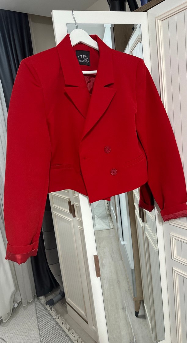 Kırmızı kadın ceket, düğmeli, normal boyda ve uzun kolludur. Parlak görünümlü ve yumuşak dokulu kumaştan yapılmıştır. Ofis ve günlük kullanım için uygundur.