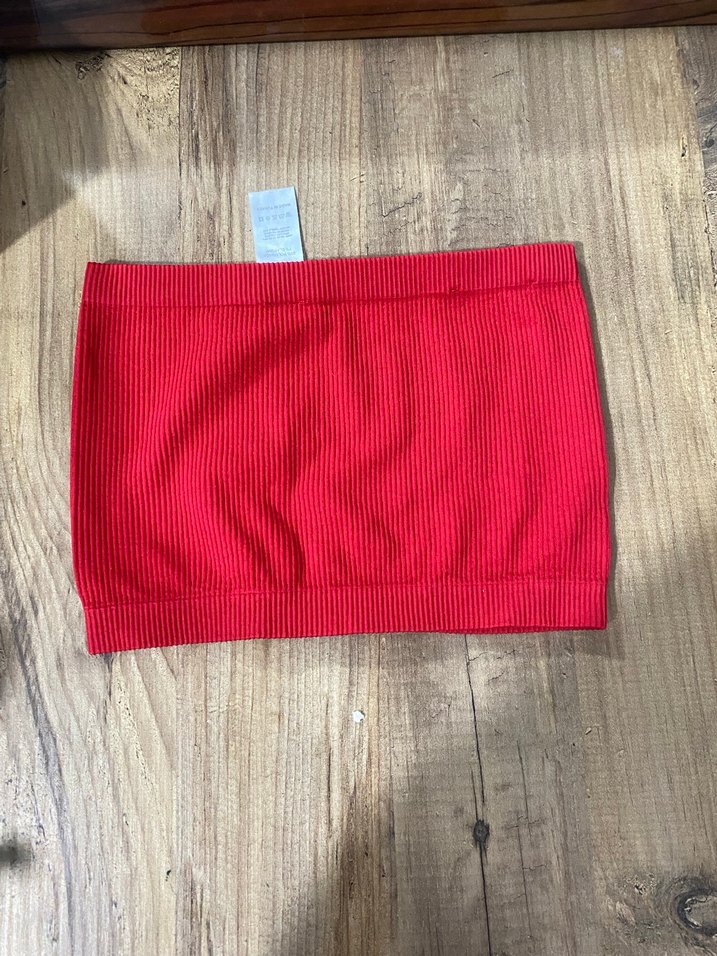 Kırmızı, elastik kumaştan yapılmış, tek renkli ve rahat kesim kadın crop top. Kayık yaka ve ince askılı, günlük kullanıma uygun.