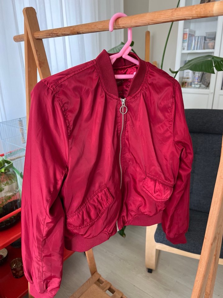 Kırmızı kadın ceketi, fermuarlı ön ve parlak sentetik kumaş ile tasarlanmıştır. Uzun kollu, bol kesim ve yakası notched lapel stilde, gündelik sokak modası için uygundur.