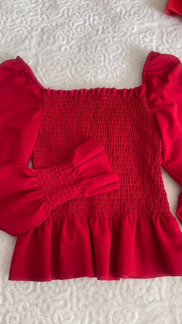 Kırmızı Kadın Fırfırlı Bluz, Uzun Kollu