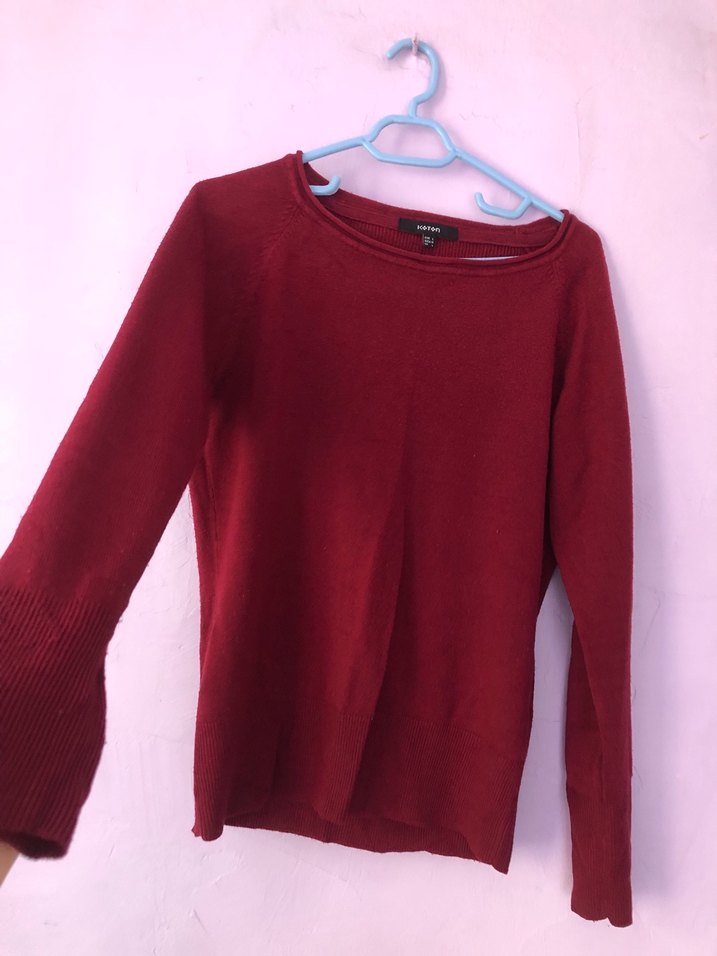 Kırmızı kadın triko kazak, yuvarlak yaka ve uzun kolludur. Yumuşak yünden örülmüş, düz dokulu ve midi uzunluktadır. Günlük rahat kullanım için uygundur.