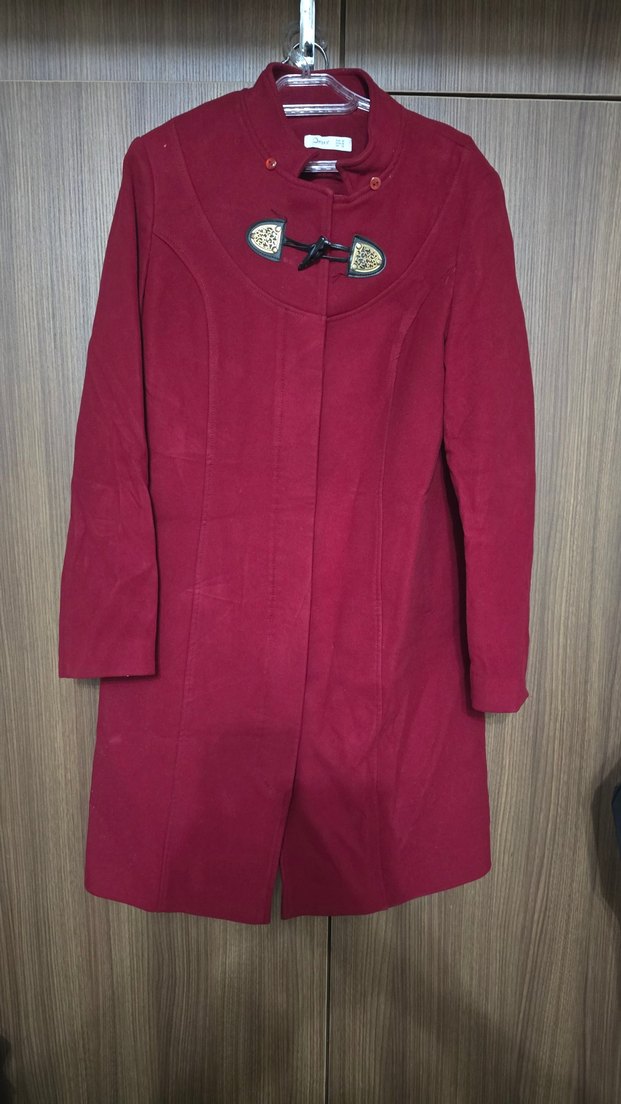 Kırmızı kadın kaban, yüksek yakaya ve özel tokalı kapama detayına sahiptir. Uzun kollu ve vücuda oturan kesimlidir. Soğuk havalar için uygundur.