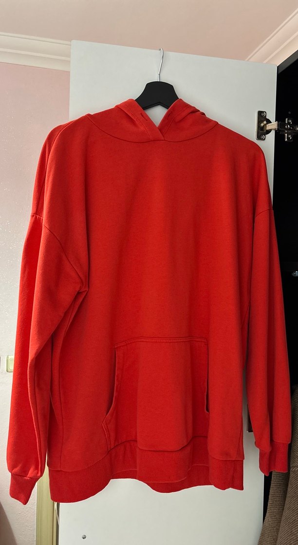 Kırmızı renk, uzun kollu, kapüşonlu ve rahat kesim kadın sweatshirt. Yumuşak ve sıcak kumaştan, günlük kullanıma uygun sade tarzda, ön cep detaylı.