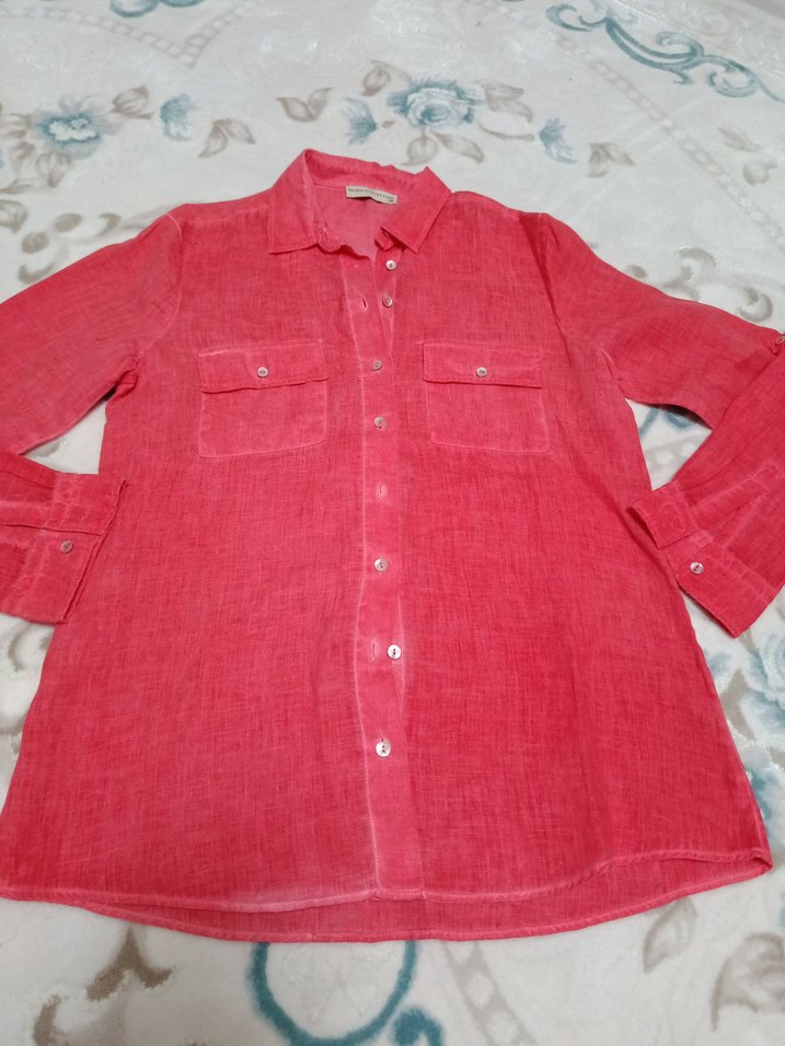 Kırmızı keten gömlek, uzun kollu, düğmeli ve yakalıdır. Salaş kesim ve desensiz tasarımıyla günlük kullanıma uygundur.