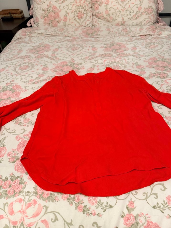 Kırmızı, uzun kollu kadın gömleği, rahat kesim ve yuvarlak yaka ile keten kumaştan yapılmıştır. Düğmeli ve midi boyda, bohem tarzına uygundur.