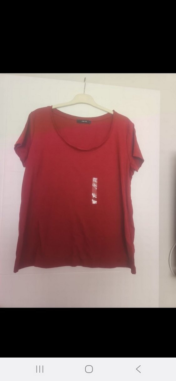 Kısa kollu, yuvarlak yakalı kırmızı kadın tişörtü, salaş kesim ve ipeksi kumaştan. Günlük kullanıma uygun, desen içermeyen rahat bir sokak stili.