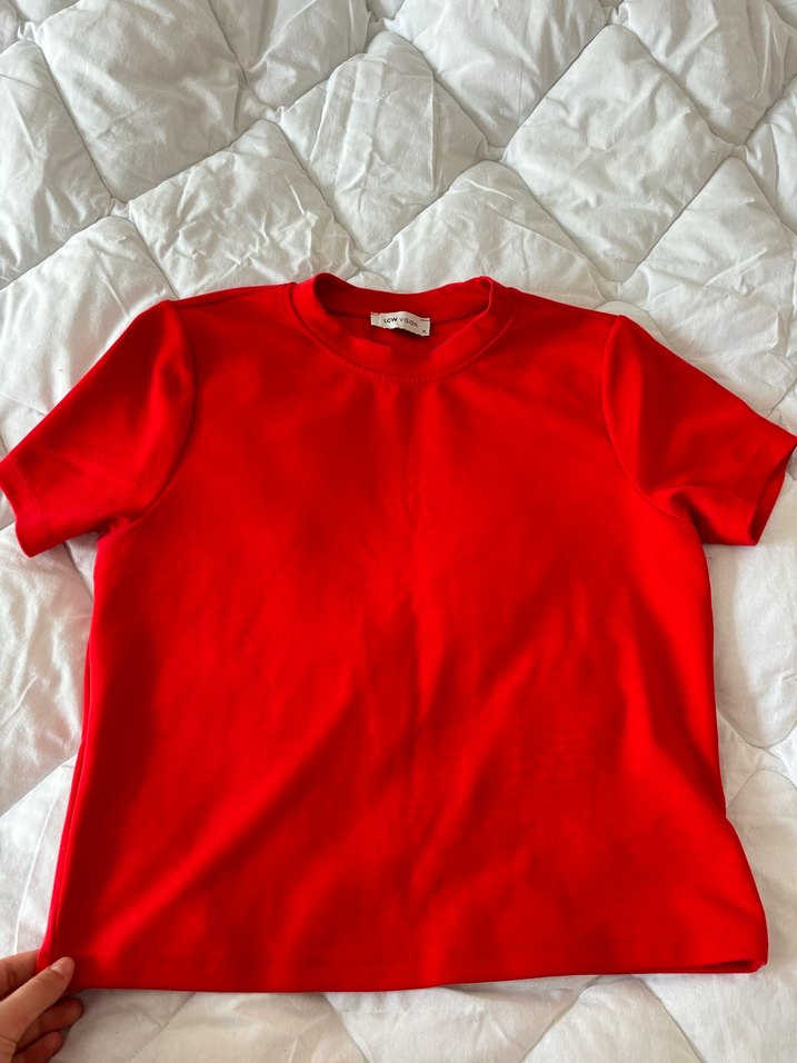 Kırmızı, kısa kollu, yuvarlak yaka kadın tişörtü. Düz ve sade, sentetik yumuşak kumaştan, günlük sokak stiline uygun.