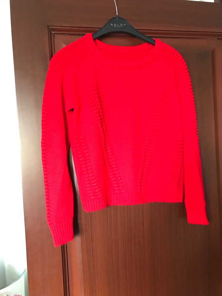 Fitted kırmızı triko kazak, yuvarlak yaka ve uzun kolludur. Kısa boyu ve sade tasarımıyla rahat, renkli ve basic bir sokak stili parçasıdır. Boy 50 cm iki kol arası 44 cm yeni