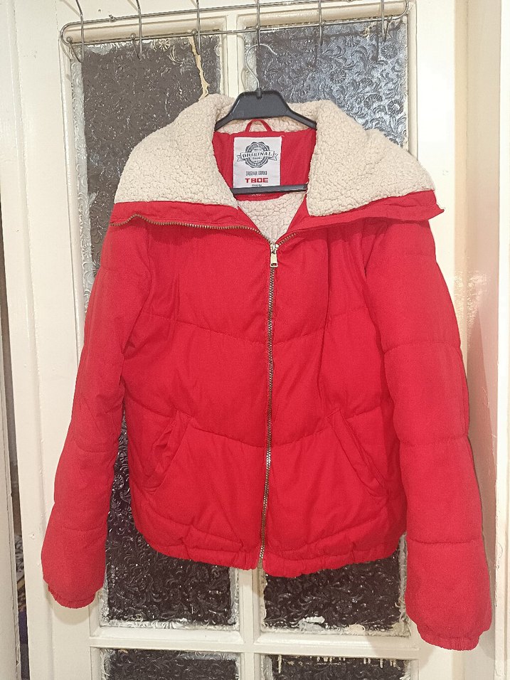 Kırmızı kadın kışlık mont, yüksek ve katlanabilir yakalı. Montun içi ve yakası yünlü.Uzun kollu, rahat stil. 36 ve 38 bedenler için uygundur.